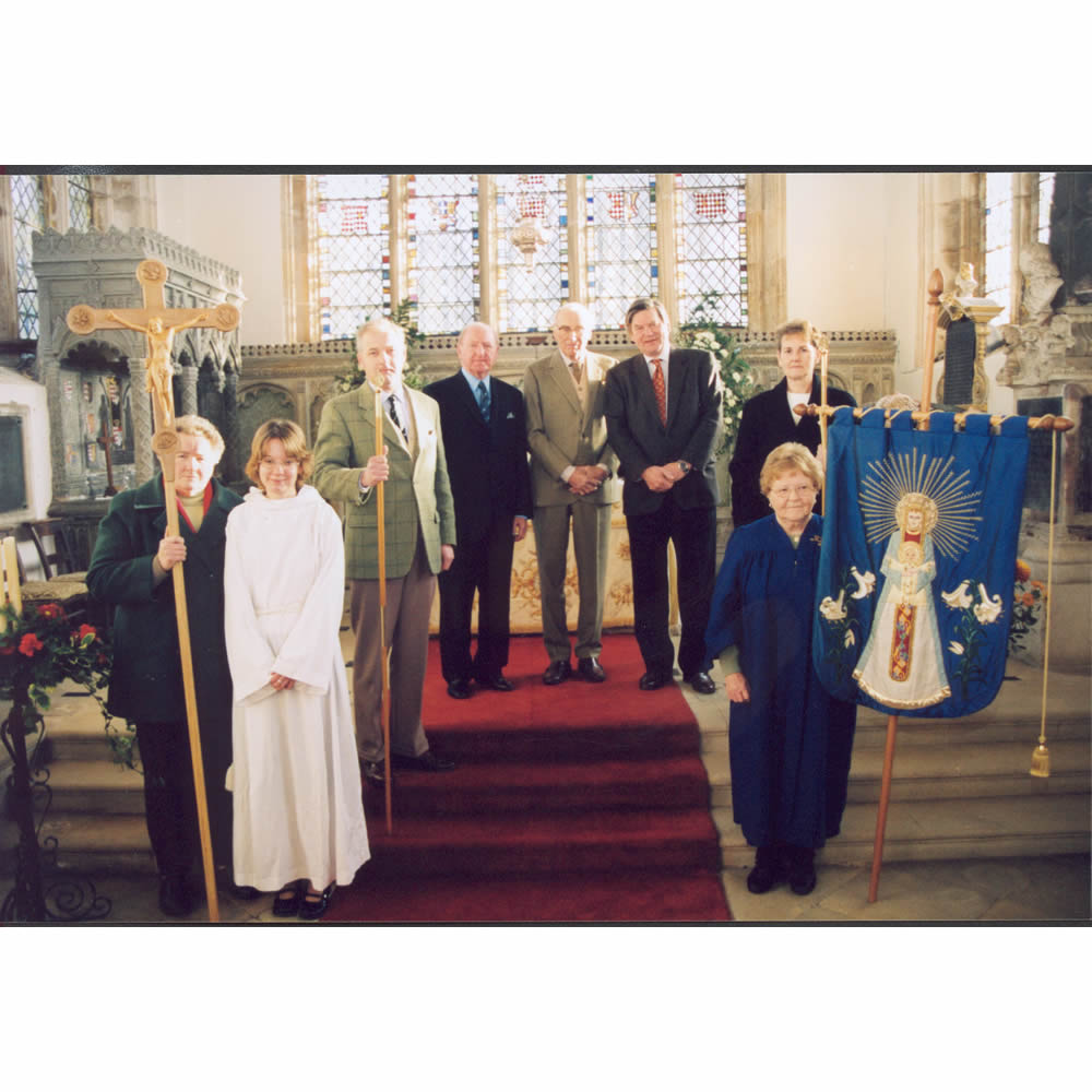 Fig D1 (Fig 17o) Church Laity. L toR : Fay Jarvis (cross), Dora Hooper (server), William Craven (churchwarden), Roy Armitage (former churchwarden) , Sir Stephen Hastings(former patron), Rodney Yates (former churchwarden), Enid Johnston (churchwarden), Gina Hill (verger).
