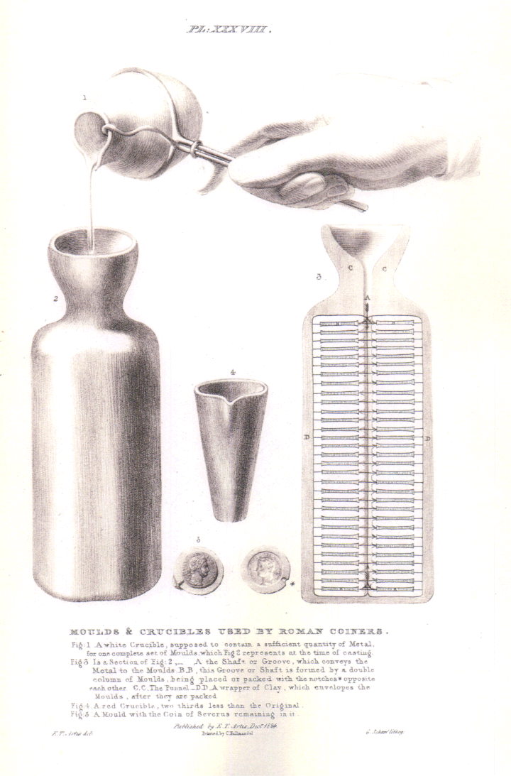 Moulds and Cruicibles used by Roman coiners. Fig. 1, A white Crucible, supposed to contain a sufficient quantity of metal for one complete set of moulds, which Fig. 2, represents at the time of casting. Fig.3, is a section of Fig. 2.-A. The Shaft or Grove which conveys the metal to the moulds B. B. This grove or shaft is formaed by a doulbe column of moulds being placed or packed with notches opposite each other. C. C. The Funnel. D. D. A wrapper of clay, which envelopes the moulds, after they are packed. Fig. 4. A red Crucible, two thirds less than the original. Fig. 3. A Mould, with the coin of Severus remaining in it.